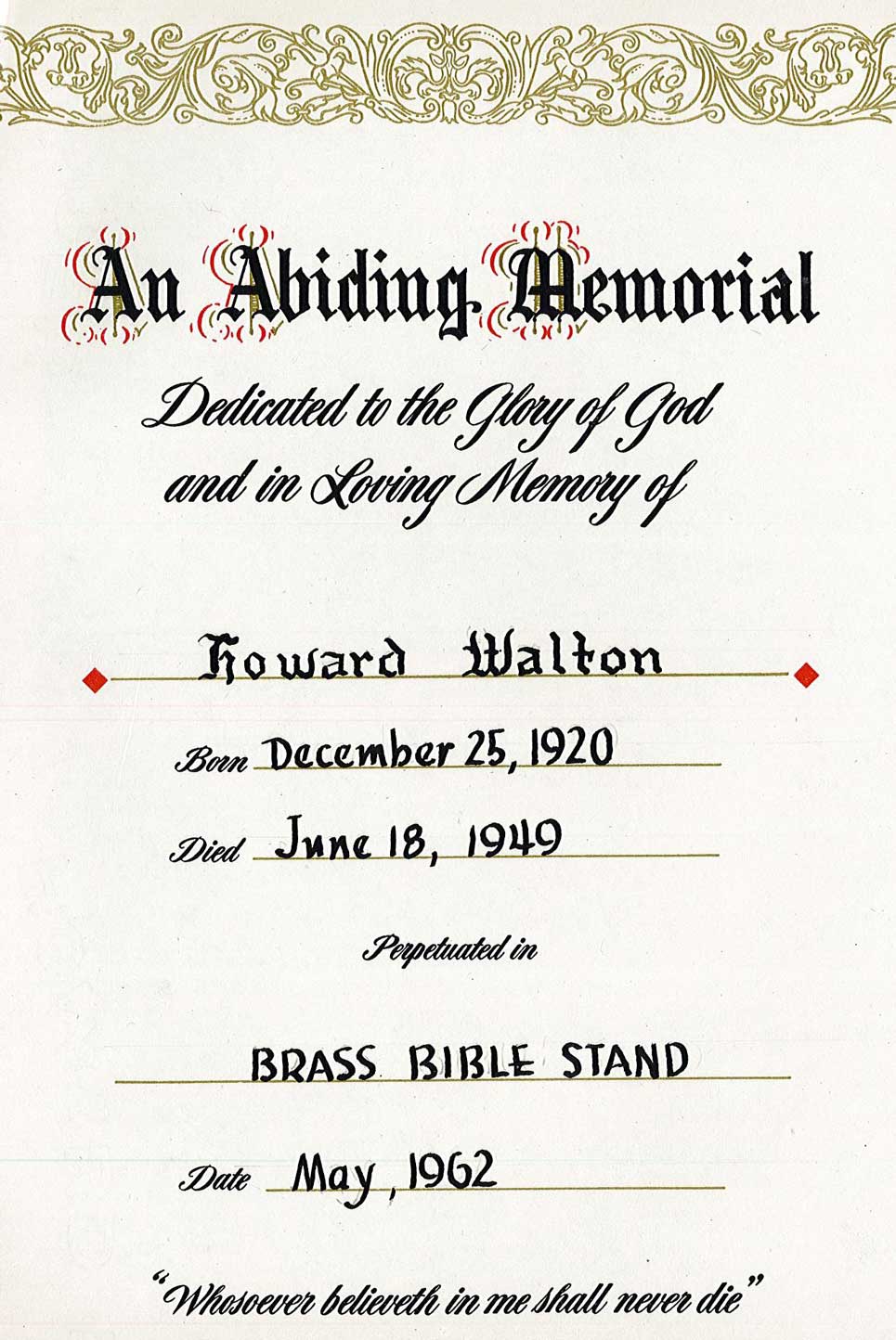 Howard Walton Born: December 25, 1920 Died: June 18, 1949 Perpetuated In: Brass Bible Stand Date Perpetuated: May, 1962