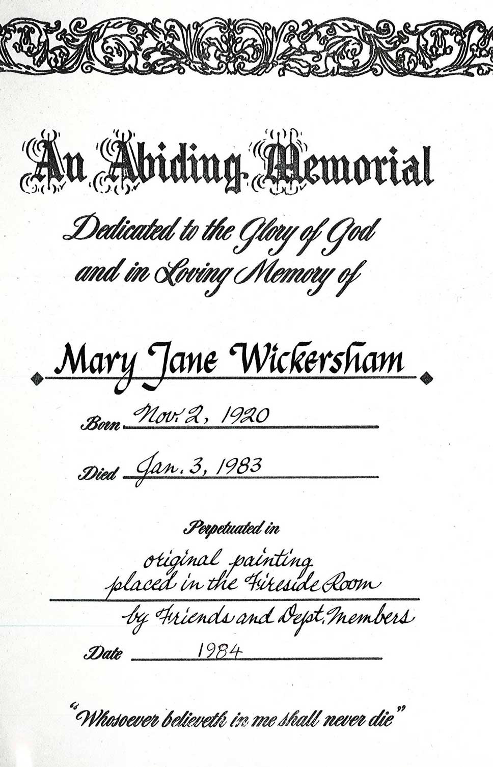Mary Wickersham Born: November 2, 1920 Died: January 3, 1983 Perpetuated In: Original Painting placed in the Fireside Room Date Perpetuated: 1984