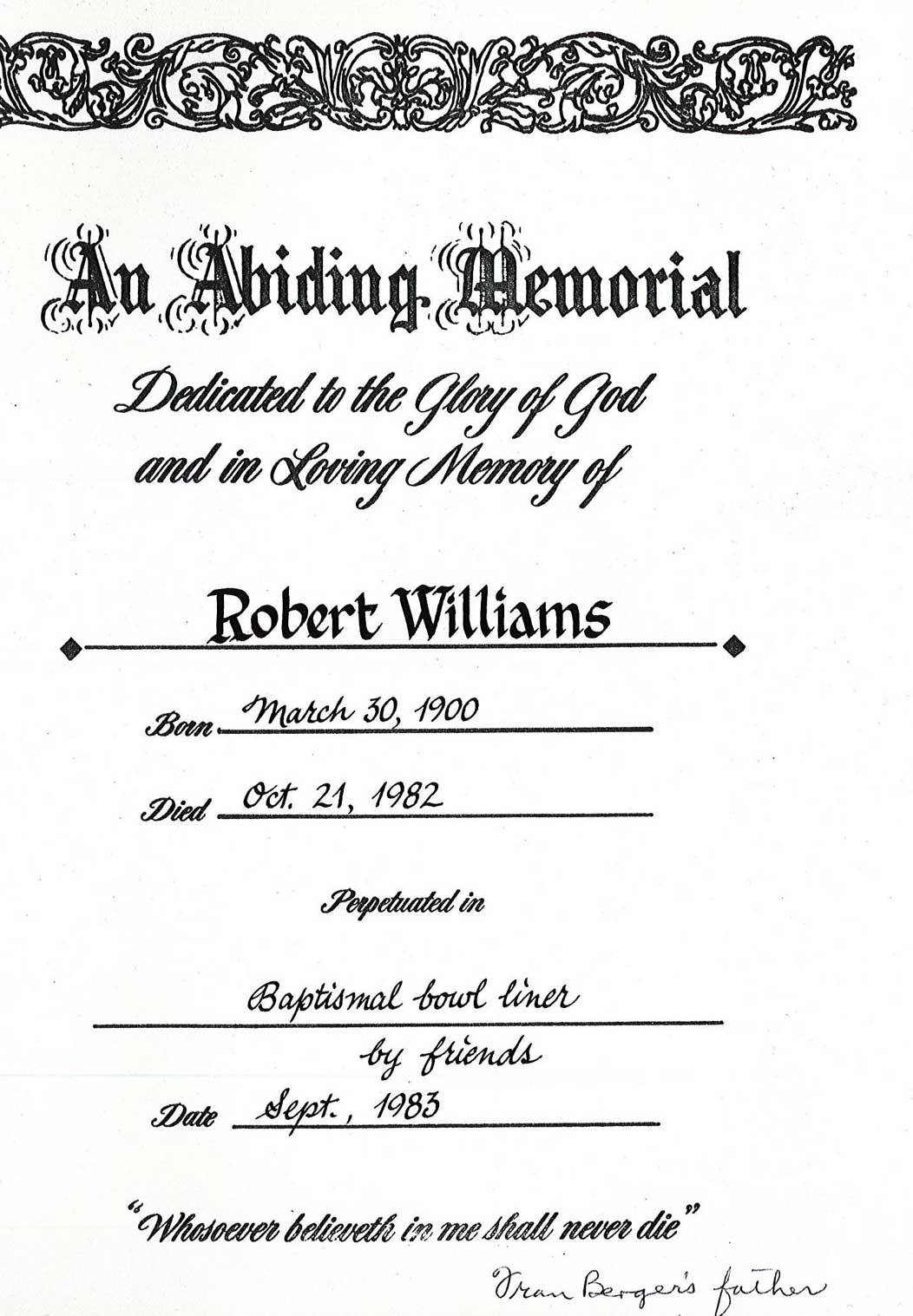 Robert Williams Born: March 30, 1900 Died: October 21, 1982 Perpetuated In: Baptismal Bowl Liner Date Perpetuated: September, 1983
