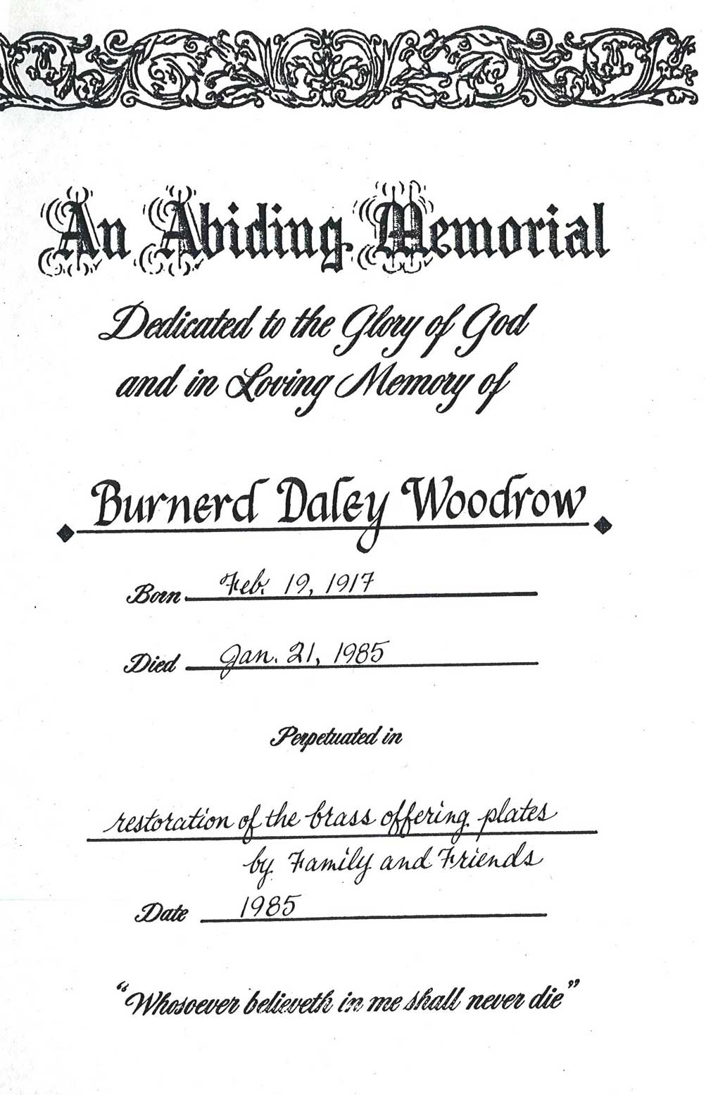 Burnerd Woodrow Born: February 19, 1917 Died: January 21, 1985 Perpetuated In: Restoration of Brass Offering Plates Date Perpetuated: 1985 Perpetuated By: Family and Friends